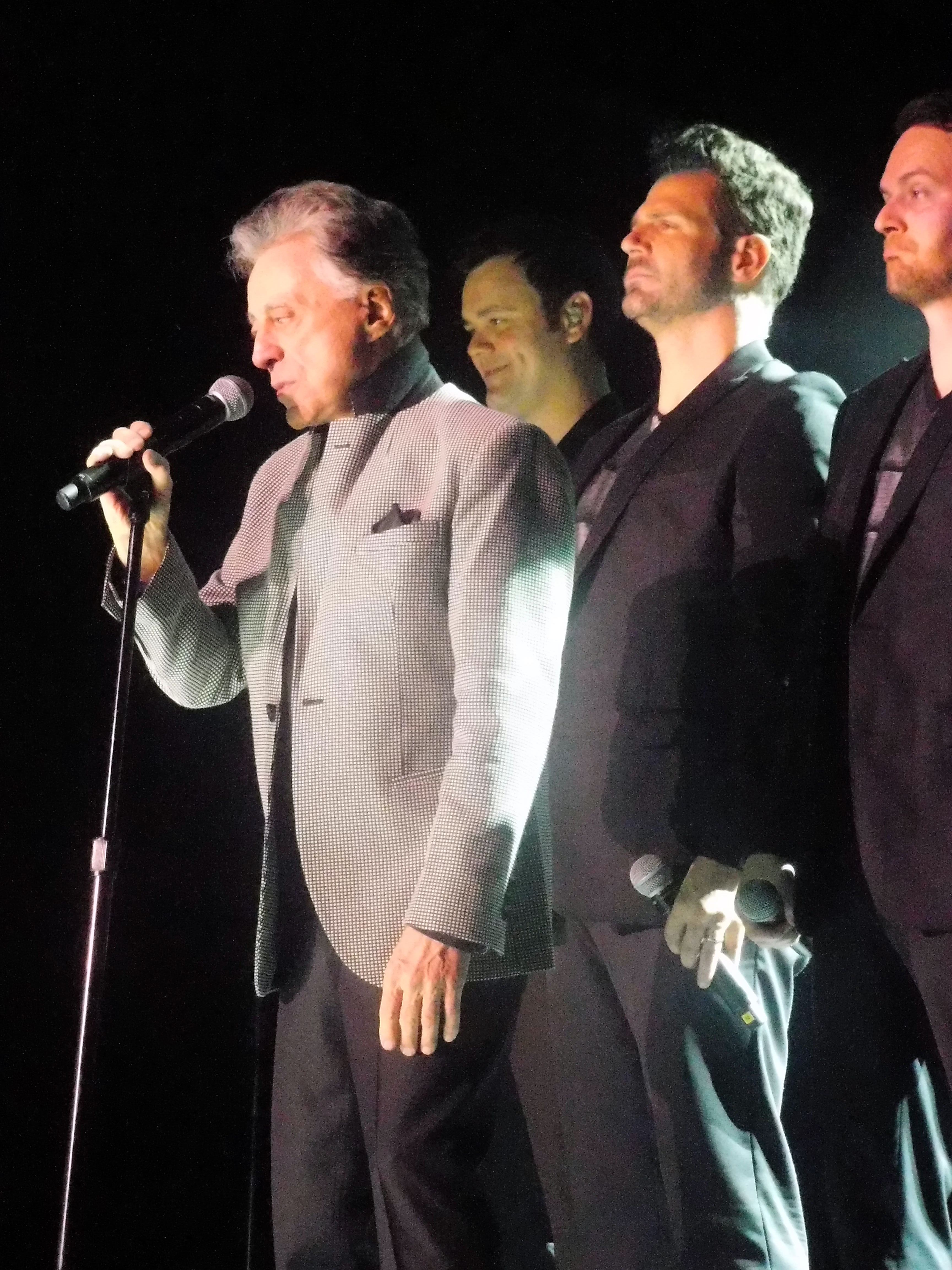At times in the Sixties, it seemed that the Seasons must have had too many songs that deserved to be singles and other bands took them on and made versions that became better known than the recording from the band with which they originated. Such is the case with “Silence is Golden” which in the UK became a huge hit for The Tremeloes in a version which aped the Seasons recording, vocals and arrangement exactly. Tonight, the four back singers who help to make the show look a little more like the “Jersey Boys” concept (Brandon Brigham, Brian Brigham, Todd Fournier, Brad Sharp) join Valli at the front of the stage with their mics and show their vocal chops on backing. They return to the rear of the stage for the next track a song which like “Fallen Angel” is much better known in the UK than in the Seasons’ homeland. “The Night” is the song which was recorded for the “Chameleon” album in the very early seventies during Valli and Gaudio’s stint with Motown but sank without a trace.